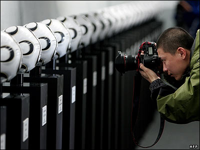عکاسی در حال عکس گرفتن از توپ هایی که قرار است در جام جهانی فوتبال 2006 مورد استفاده قرار گيرد و در مقابل ساختمان پارلمان در برلن آلمان به تماشا گذاشته شده است.