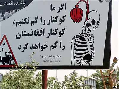 مبارزه با مواد مخدر از طريق بيلبورد در کابل: کارگر افغانی در حال نصب کردن آگهی. گفته می شود 90 درصد از ترياکی که به هروئين تبديل شده و در اروپا مورد استفاده قرار می گيرد، در افغانستان توليد می شود. |