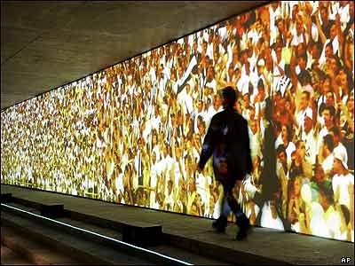 يکی از بازديدکنندگان نمايشگاه "Pelestation - The Legend in Action" که در مورد پله، فوتباليست سابق برزيلی در برلن آلمان برگزار شده است. اين نمايشگاه کوشش می کند بازديدکنندگان را با زندگی پله از زوايای گوناگون آشنا کند.