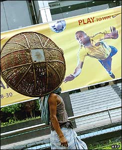 کارگر بنگلادشی از کنار پوستری با عکس رونالدو، فوتباليست برزيلی، در يکی از خيابان های داکا می گذرد. قرار است برای جلوگيری از قطع برق در دوران مسابقات فوتبال در اين کشور اقداماتی انجام گيرد.
