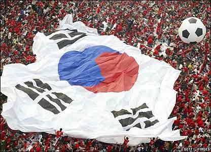 طرفداران فوتبال کره جنوبی در سئول. امروز در مسابقات جام جهانی فوتبال در آلمان، مسابقه بين کره جنوبی و توگو با نتيجه دو بر يک به نفع کره جنوبی انجام شد.