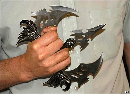 "سلاحی با ظاهر ترسناک" که به پليس بريتانيا تحويل داده شده است. در اين کشور از مردم خواسته شده تا سلاح های سرد خود را تحويل پليس دهند.