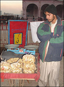 فروشنده جوان پس از يک روز سرد زمستانی، ظاهرا از فروش خود راضی نيست.