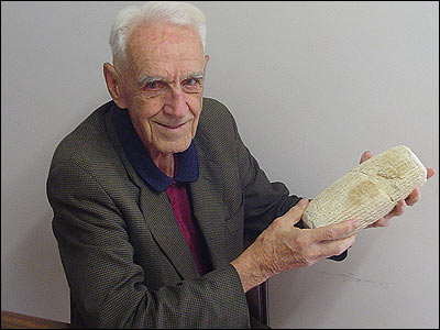 دیوید داون، نود ساله، در حالی که منشور حقوق بشر کوروش را در دست دارد. او سردبیر مجله حفاری های باستان شناسی است. این مجله ۲۵ سال است که در استرالیا منتشر می شود.