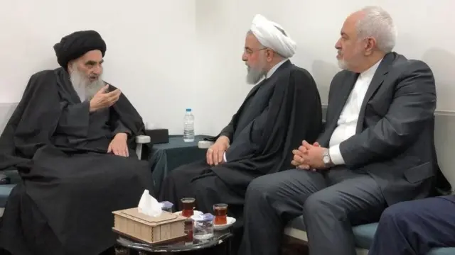 محمدجواد ظریف، وزیر امور خارجه ایران و ایرج مسجدی، سفیر این کشور در بغداد آقای روحانی را در ملاقاتش با آیت الله سیستانی همراهی می کنند.
