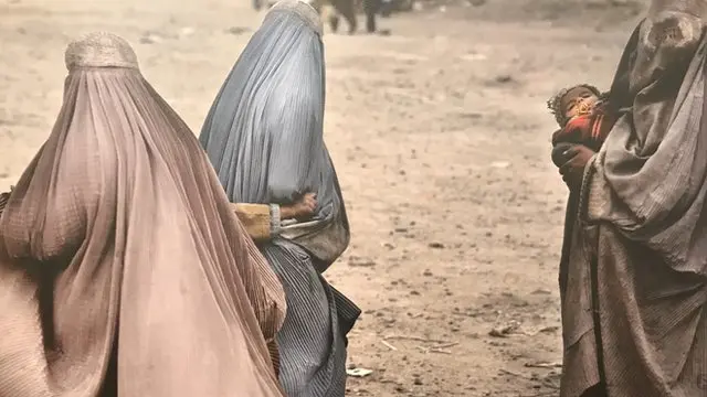 سه زن فقیر برقعپوش که در قندهار در حال گدایی هستند، نیز موضوع عکس دیگری از این مجموعه است. یکی از این زنان با کودکی در آغوش رو به دوربین کرده، ولی چشمهایش پشت پردهی مشبک برقع پیدا نیست. شاید برای پیبردن به چگونگی و نحوهی دید زنان افغان است که نیدرینگهاوس در آوریل ۲۰۱۳، عدسی دوربین را ابتدا با پردهی مشبک برقعی پوشاند و از پشت آن تصویر چند زن افغان را در بازار هنگام خرید مواد غذایی به ثبت رساند. نتیجهی کار، پسزمینهای زرد و سرخ و آبی را نشان میدهد که با خطهای افقی و عمودی سیاه، هاشور خورده است. تشخیص شکل و شمایل و شمار زنان، همچنین فضای بازار و دکههای فروش از پس پردهی شبکهدار، تقریبا ناممکن است: زنان افغان از پشت این پنجرهی مشبک هر لحظه با دنیایی مخدوش، کج و کوله و ناملموس روبرو میشوند.