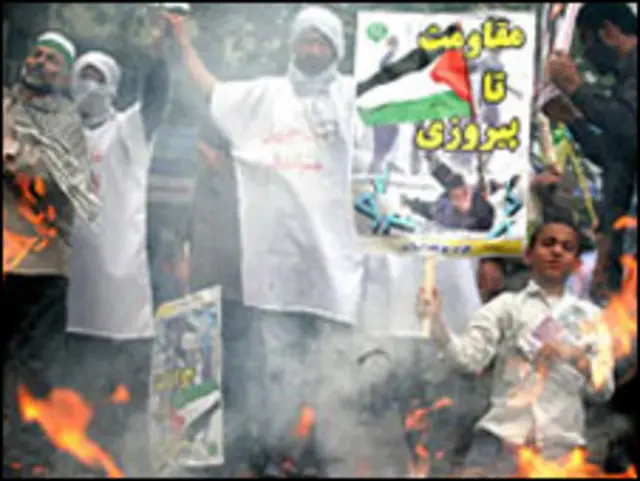 محمود احمدی نژاد، رئیس جمهوری که در یکی از نقاط نزدیک دانشگاه تهران به تظاهرکنندگان پیوسته بود در گفتگو با خبرنگاران دیدگاه های خود را در مورد اسرائیل ابراز داشت.