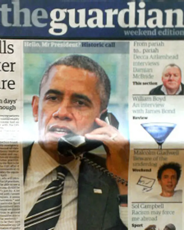 گاردین عکس یک خود را به باراک اوباما در حال گفتگوی تلفنی با حسن روحانی اختصاص داده و تیتر "الو، آقای رئیسجمهور؟" را انتخاب کرده است.