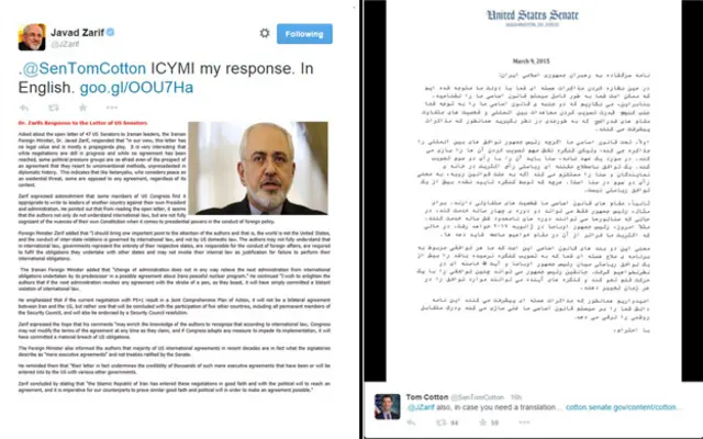 آقای ظریف هم در واکنش به توییت آقای کاتن، متن پاسخ خود به نامه سناتورها را با خطاب قرار دادن سناتور کاتن <link type="page"><caption> توییت کرده</caption><url href="https://twitter.com/JZarif/status/575133535528427520" platform="highweb"/></link> و با استفاده از اصطلاحات مخفف رایج در توییتر، نوشته: "اگر احیانا ندیدهای. پاسخ من. به انگلیسی".