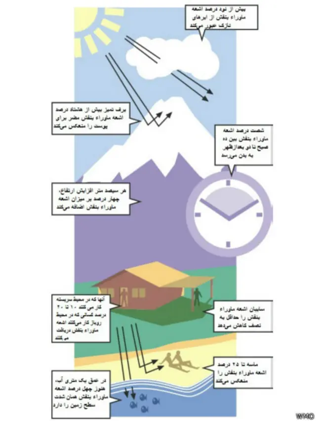 رئیس اداره بهداشت پرتوهای وزارت بهداشت همچنین گفت ایران جزء کشورهایی است پرتوهای آفتاب در آن "بالا" است و "چهار فصل پرتوگیری" آفتاب دارد به همین دلیل بیماریهای پوستی مثل سرطان پوست و آسیبهای چشمی مثل "آب مروارید" در ایران شیوع دارد.