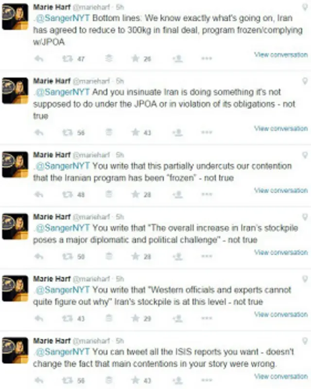 خانم هارف این بار در توییتر در چند پیام خطاب به این روزنامهنگار نوشت که بندهای مختلفی از گزارش او "نادرست" است.