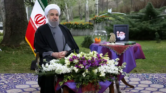 رئیسجمهوری ایران، به توافق هستهای کشورش اشاره کرده و گفته است که در سال گذشته "برجام به فرجام مطلوب" رسید، "زنجیرههای تحریم، پاره شد" و "زمینه برای فعالیتهای اقتصادی مهیا شد."