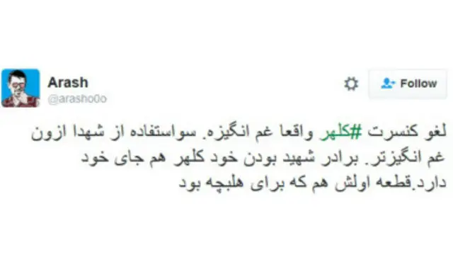 کاربر دیگری به نام مجله گوناگون به کنایه توئیت کرد: "کنسرت کیهان کلهر به دلیل مشکلات امنیتی لغو شده و اطلاعات ساخت موشکهای بالستیک صلح آمیز را لو میدهد."