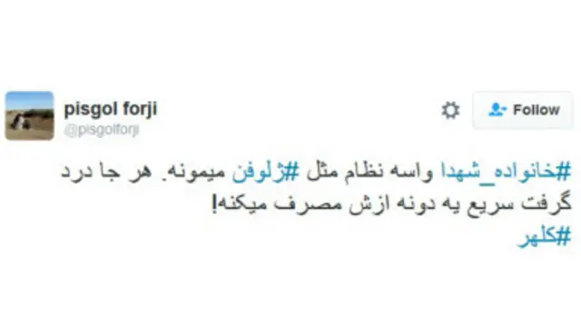 کاربری به نام پیسگول با طنز تلخی نوشت: "خانواده شهدا برای نظام مثل ژلوفن میمانند هر جا درد گرفت سریع یه دونه ازش مصرف می کنند."