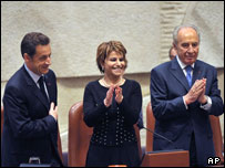 نیکولا سارکوزی رئیس جمهور فرانسه در جریان سفر خود به اسرائیل در پارلمان این کشور (کنست) نیز سخنرانی کرد. آقای سارکوزی در سخنان خود در کنست، ضمن فراخواندن دولت عبری به توقف ساخت آبادیهای یهودی نشین در کرانه باختری رود اردن و بیت المقدس شرقی، برنامه اتمی ایران را نیز به شدت مورد حمله قرار داد. رئیس جمهور فرانسه با توصیف مساله هستهای ایران به "بحران مرکزی جهان" اعلام کرد که دستیابی ایران به سلاح هستهای غیر قابل تحمل است. نیکولا سارکوزی ضمن حمایت قاطع خود از امنیت اسرائیل، در اشارهای روشن به ایران تاکید کرد که هر کشوری که موجودیت اسرائیل را تهدید کند، فرانسه را سد راه خود خواهد دید. نمایندگان احزاب مختلف اسرائیلی در کنست از اعلام همبستگی رئیس جمهور فرانسه با دولت عبری اظهار شادمانی کردند، اما آقای سارکوزی در عین حال سخنانی بر زبان راند که مورد خوشایند احزاب راستگرای اسرائیل نبود. رئیس جمهور فرانسه، امنیت اسرائیل را در گرو تشکیل کشور مستقل فلسطینی دانست و ضمن فراخواندن دولت یهود به توقف ساخت شهرکهای یهودی نشین در کرانه غربی، خواستار تقسیم بیت المقدس به صورت پایتخت دو کشور اسرائیل و فلسطین شد. در واقع، لزوم تشکیل کشور مستقل فلسطینی و توقف شهرک سازی در کرانه غربی و بیتالمقدس شرقی، یک موضع بین المللی از جمله موضع آمریکاست، اما تاکید بر ضرورت باز پس دادن بیتالمقدس شرقی به فلسطینیها در پارلمان اسرائیل، به عنوان یکی از شروط تحقق صلح در خاورمیانه، حرکتی است که به نظر میرسد فقط از یک رئیس جمهور فرانسوی بر میآید. واقعیت این است که از نظر اسرائیلیها، فرانسه برای سالهای طولانی متحد اعراب محسوب میشد و بدین جهت، روابط پاریس – تلآویو هیچگاه به گرمی روابط اسرائیل با سایر کشورهای غربی نبود.