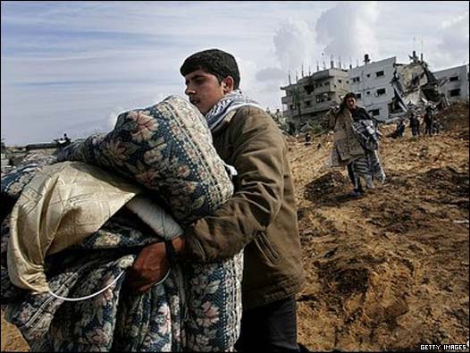 اما بعضی ها در برگشت به خانه فقط با اجساد اعضای خانواده شان در زیر آوار روبرو می شوند. به گقته فلسطینی ها دست کم هزار و سیصد تن جان خود را از دست داده اند. اما بعد از پاکسازی ساختمان ها از خرده سنگ و پاره آجر، انتظار می رود این رقم افزایش بیابد.