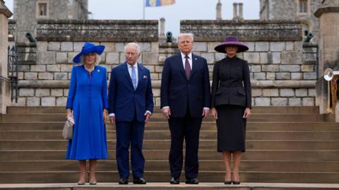 توضیح تصویر، پادشاه و ملکه بریتانیا در کنار دونالد ترامپ و همسرش ملانیا