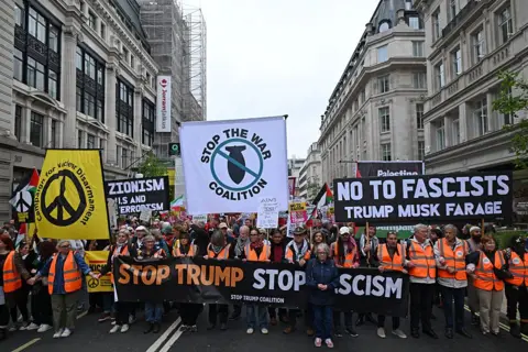 کیلومترها دورتر از مراسم مجلل استقبال از رئیسجمهور آمریکا در کاخ وینزور، مخالفان دونالد ترامپ راهپیمایی بزرگی را در مرکز لندن برگزار کردهاند.