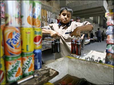 به گزارش صندوق کودکان سازمان ملل متحد و دولت عراق، طی سال گذشته 3/1ميليون کودک در سنين هشت تا شانزده سال، در خيابانهای بغداد به دستفروشی سيگار، روزنامه و ... مشغول بوده اند. (تصويری از پسر عراقی و دکه نوشابه فروشی)