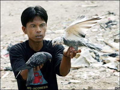 يک مرد در حال بازی با کبوترهايش در جاکارتا - اندونزی. اخيرا يک پسربچه در اين کشور به بيماری آنفولانزای مرغی مبتلا شده که شمارمبتلايان ناشی از اين بيماری در اندونزی را به 40 نفر رسانده است. اندونزی بيشترين تلفات ناشی از آنفولانزای مرغی را داشته است.
