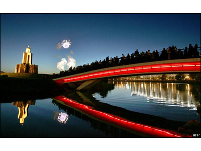 مردم مشغول تماشای مراسم آتش بازی، در نزديکی کليسای ارتودکس در مينسک-بلاروس، که به مناسبت جشن روز آزادی بلاروس برگزار شد.
