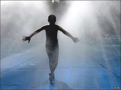پسر بچه آلمانی در حال دويدن در نزديکی يک فواره آب در برلين. دمای هوا در برلين به 36 درجه سانتی گراد رسيده است.