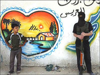 پسر فلسطينی و يک فرد نقابدار در باريکه غزه. نظاميان اسرائيل در ادامه پيشروی خود در اراضی فلسطينی با مردان مسلح در نوار غزه درگير شده اند. |