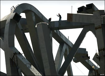 کارگری که در برابر بنای آهنی استاديوم المپيک پکن بسيار کوچک ديده می شود. المپيک 2008 در چين برگزار خواهد شد.