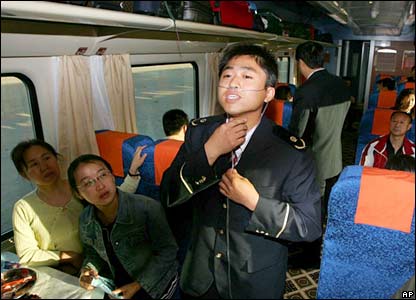 توجه مسافران قطار به طريقه استفاده از ماسک اکسيژن در مواقع ضروری در قطار اکسپرس چين- تبت