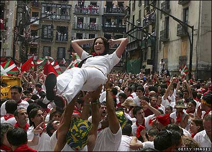 طرفداران گاو دوانی در اولين روز از مسابقات گاوبازی پامپلونای اسپانيا. گاو دوانی پيش از شروع رسمی مسابقات گاوبازی دربرخی از مناطق شمالی اسپانيا رواج دارد