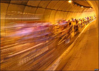گروهی از دوچرخه سواران هنگام گذشتن از تونل، در سومين مرحله از 'تورنومنت تور دو فرانس'