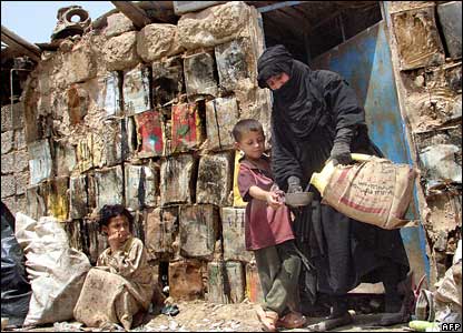 مادر در حال پر کردن کاسه آب پسرش، در منطقه 'حلبی آباد' در شمال بغداد