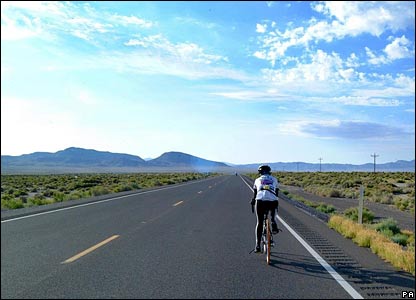 جين تاملينسون، که خود مبتلا به بيماری سرطان است، از صحرای نوادا عبور کرد. او قرار است برای کمک به بيماران سرطانی، 4200 کيلومتر سرتا سر آمريکا را با دوچرخه رکاب بزند.