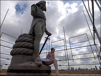 لوسی بارنز از هنرجويان مدرسه باله بريتانيا قبل از اجرای حرکت های نمايشی، در کنار مجسمه نلسون در مرکز لندن، ديده می شود.