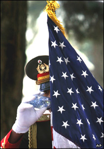 استراحت يک افسر گارد تشريفات افغانستان، قبل از کنفرانس مطبوعاتی دونالد رامسفلد، وزير دفاع آمريکا و حامد کرزی، رئيس جمهور افغانستان، در کاخ رياست جمهوری افغانستان در کابل.