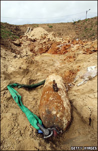 تصويری از يک بمب خنثی شده 250 کيلوگرمی، متعلق به نيروهای بريتانيايی که از جنگ جهانی دوم برجای مانده است. اين بمب در غرب فرانسه پيدا شد. در جريان خنثی سازی اين بمب 5200 ساکن اين منطقه مجبور به ترک موقت محل زندگی خود شدند. |
