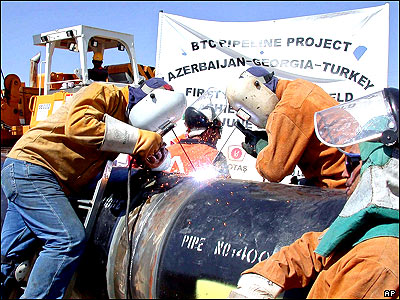 کارگران ترک درحال تعمير خط لوله گاز در جنوب ترکيه. فردا سران کشورهای ترکيه، جمهوری آذربايجان و گرجستان در شهر جيحان گرد می آيند تا خط لوله 1700 کيلومتری باکو - جيحان را افتتاح کنند.