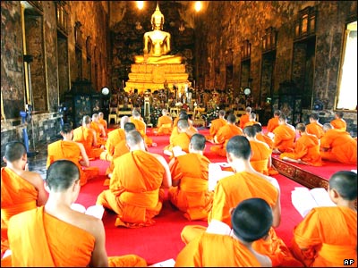 راهبان بودايی در حال دعا برای بهبودی شاه تايلند در معبدی در بانکوک.شاه تايلند برای يک عمل جراحی بر ستون فقراتش در بيمارستان به سر می برد.