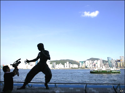 مجسمه بروس لی در خيابان "ستارگان" در هنگ کنگ که به مناسبت سی و سومين سالگرد مرگ اين هنرمند هنرهای رزمی، به نمايش در آمده است.
