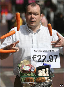 اعتراض يک ايرلندی به تفاوت 200 درصدی بين قيمت خريد محصولات کشاورزی از کشاورزان و آنچه مصرف کننده برای خريد اين محصولات پرداخت می کند. |