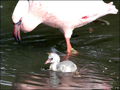 نوزاد سه روزه فلامينگو در گلاسرشاير انگلستان . اين اولين نوزاد از اين گونه فلامينگو است که در بريتانيا به دنيا می آيد. |