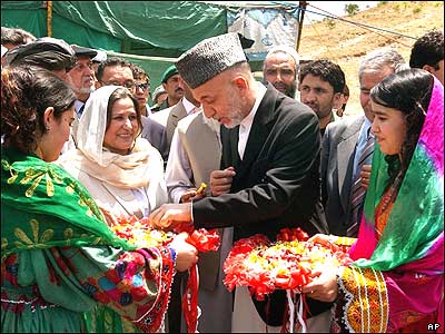 حامد کرزی رييس جمهور افغانستان در حال افتتاح يک جاده احداث شده در کابل. هزينه احداث اين جاده بيش از صد هزار دلار بوده است که از سوی بانک جهانی نامين شده است.