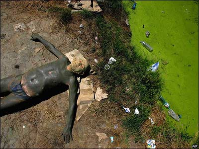 فردی که بدن خود را گل هايی با خاصيت درمانی پوشانده در کنار کانال آبی آلوده در نزديکی بلگراد در صربستان دراز کشيده است. با وجود آلودگی کانال های آب اطراف مردم برای استفاده از گل اين منطقه و نوشيدن آب معدنی پرنمک به اينجا سفر می کنند.