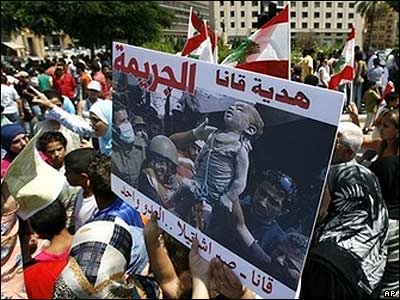 تظاهرات کنندگان لبنانی با در دست داشتن پوستری که کودکی را نشان می دهد که در جريان حمله نيروهای اسرائيلی به روستای قانا کشته شده، حملات اسرائيل را به جنوب لبنان محکوم می کنند. |