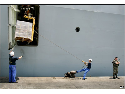 ملوانان فرانسوی کمک های دارويی را از يک ناو جنگی در بندر بيروت تخليه می کنند.