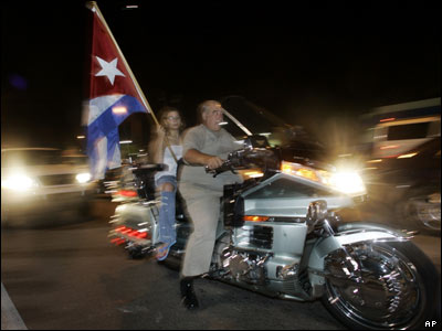 زوج کوبايی سوار بر موتور در فلوريدای آمريکا، پرچم کشورشان را به نشانه خوشحالی از بيماری فيدل کاسترو، تکان می دهند. |