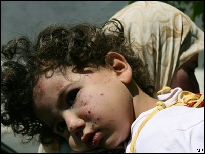 کودکان مجروح لبنانی در خانه شان در روستای بدی بمبارانهای شب گذشته لبنان باعث مختل شدن جريان کمکها و همچنين خروج مردم از لبنان به سوريه شد.