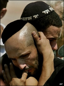 دو مرد اسرائيلی برای مرد اسرائيلی ديگری سوگواری می کنند که بر اثر حملات موشکی حزب الله لبنان به شمال اسرائيل کشته شده است