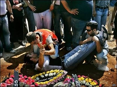 يک مقام اسرائيلی سعی دارد مردی را که بر سر قبر دو يهودی که روز پنجشنبه در حمله موشکی شمال اسرائيل کشته شدند از هوش رفته به هوش آورد.