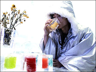 يکی از ساکنان سئول پايتخت کره جنوبی در ميخانه تازه آن شهر که دمای هوا در آن زير صفر نگه داشته می شود. کسانی که به اين ميخانه می آيند بايد شانزده دلار بپردازند. به آنها يک کت ضخيم نقره ای رنگ داده می شود و در گيلاس های يخی می نوشند...